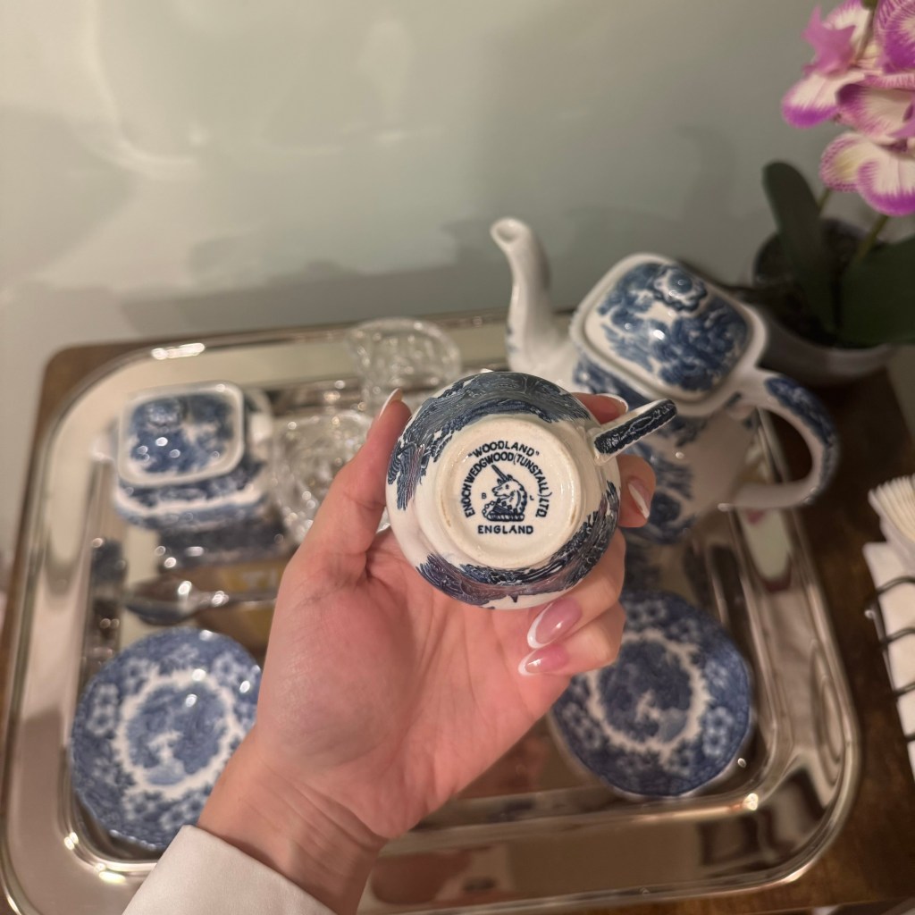 Few things evoke the charm of the English countryside quite like vintage pottery, and the Enoch Wedgwood Woodland pattern is a stunning example of this tradition. As a collector of china, I find these coffee and plate sets absolutely enchanting. They feature a timeless design, and when paired with a Waterford creamer pitcher and a matching Wedgwood sugar bowl, the combination is simply divine. These blue and white pieces are some of my favorites in my collection, we often use them as espresso cups. There’s something incredibly peaceful about the soothing contrast of the deep blue patterns against the crisp white background. Each sip from these cups feels like a moment of calm.